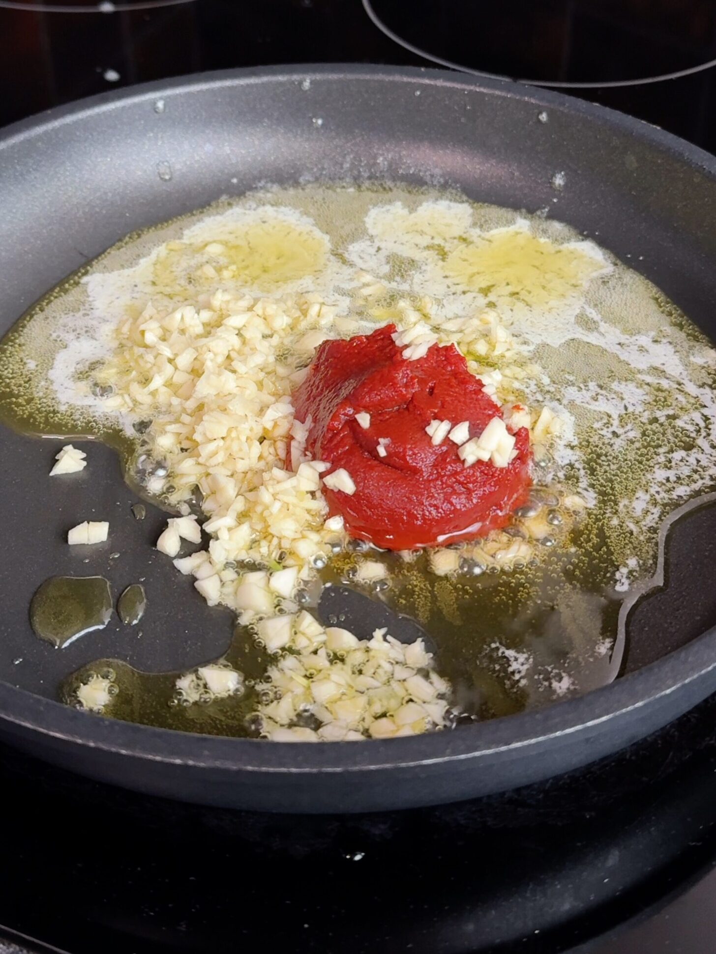 - Add garlic and tomato paste and cook until the paste deepens in color.
