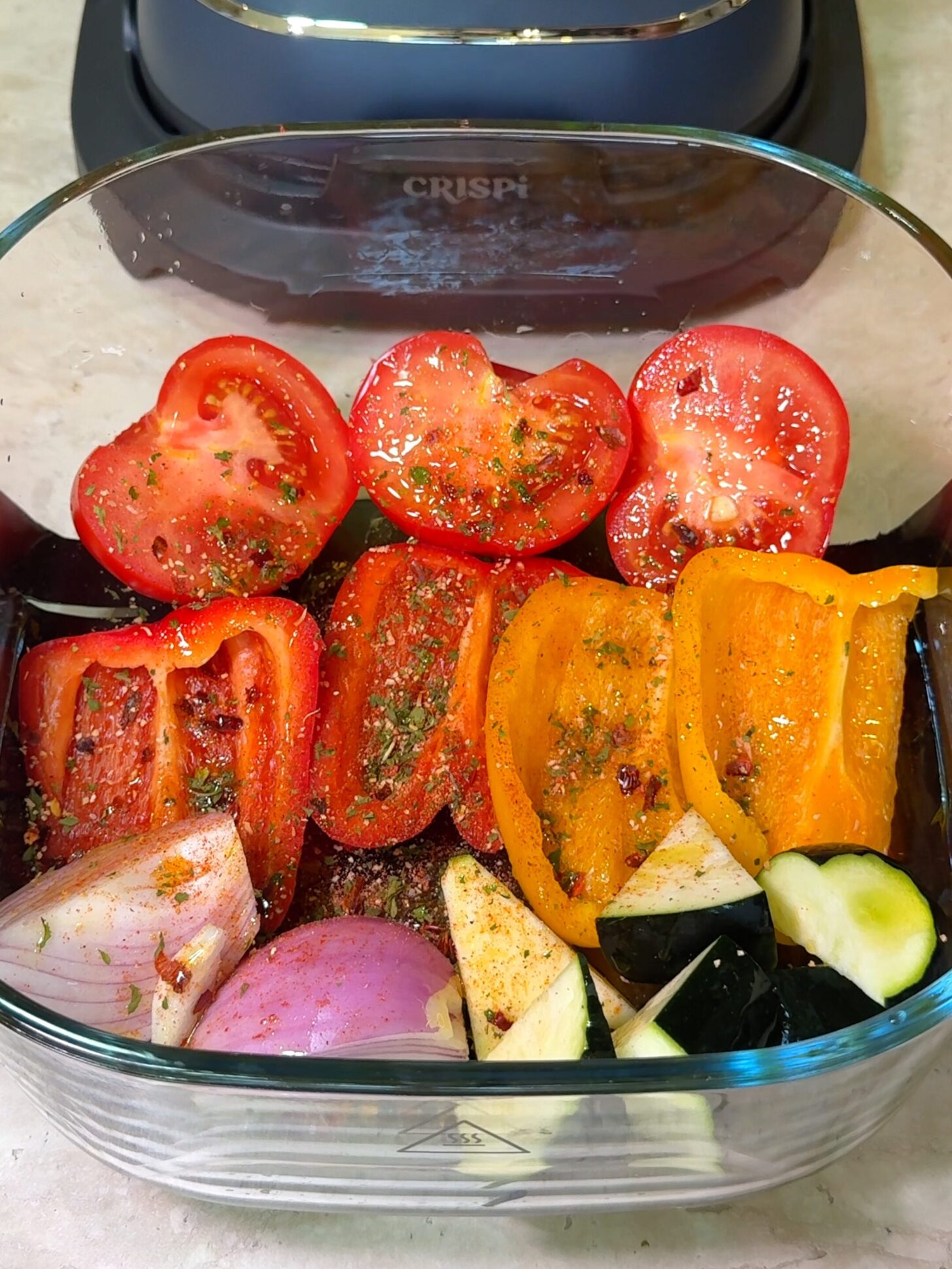 Add halved tomatoes, bell peppers, zucchini, and red onion to an air fryer-safe dish. Drizzle with olive oil and add seasoning