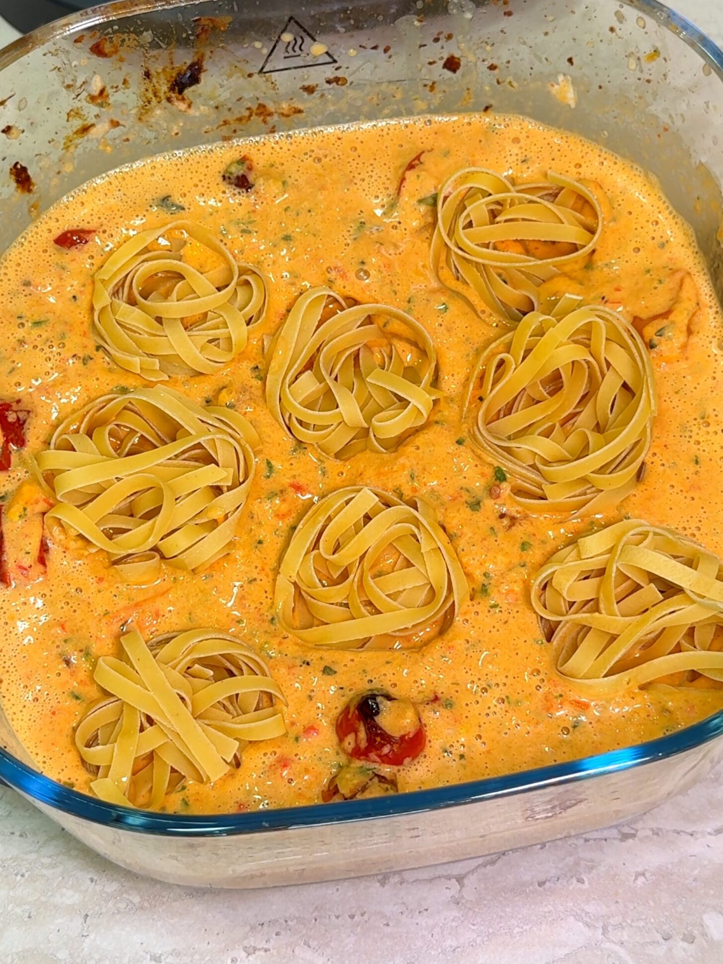 - Nest the dry pasta into the sauce, pressing it down gently.Make sure the pasta is mostly submerged in the sauce — if it’s not, either press it in more or swap for a smaller pasta shape like penne or farfalle.