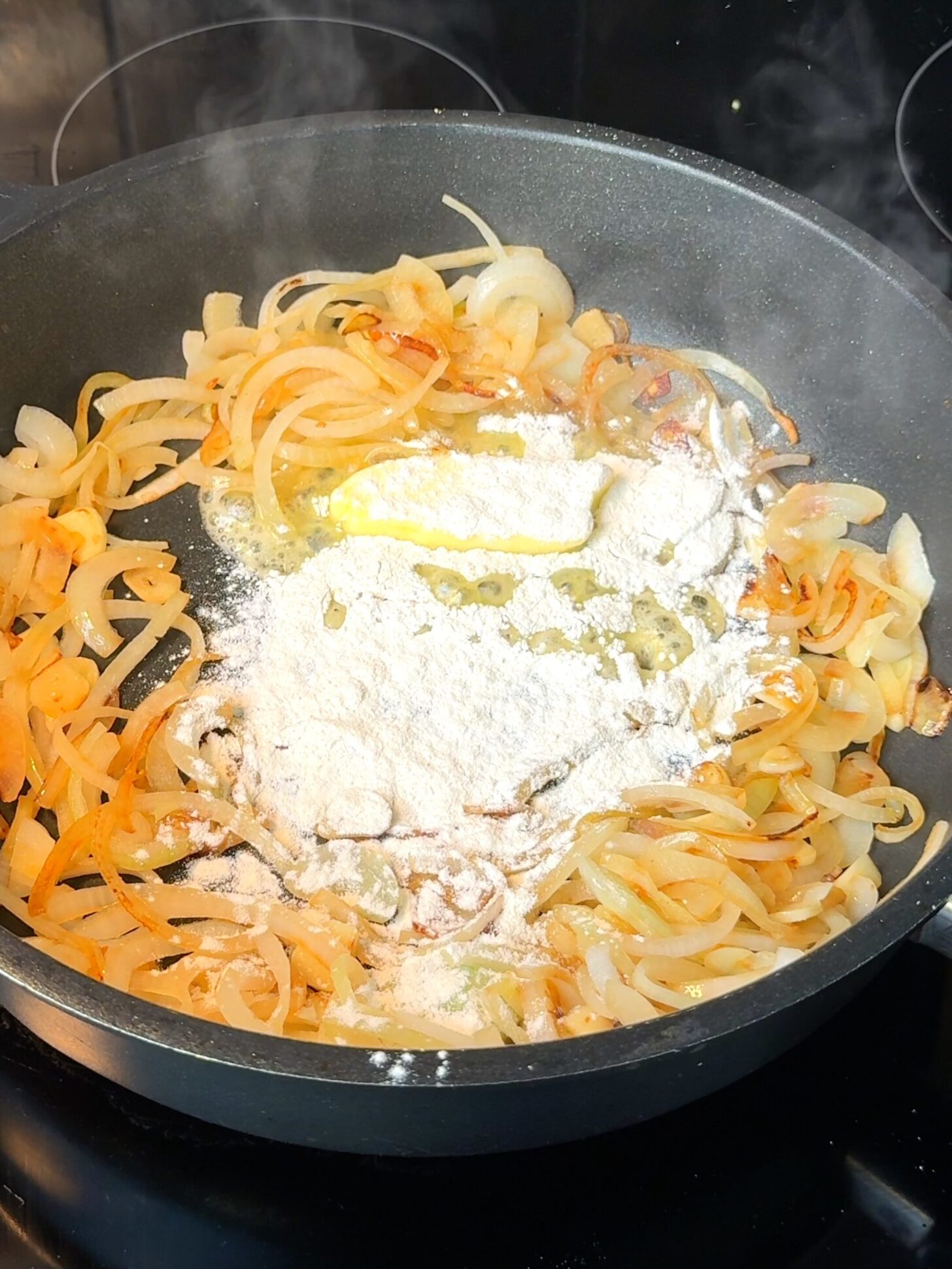 - Add vegan butter and flour. Stir and cook for 1 minute to form a roux.