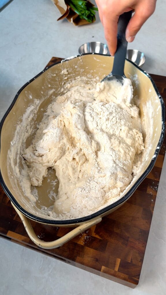 Folding replaces kneading. Each time you fold the dough, you’re building gluten structure and incorporating air, which is what gives the bread its open, airy crumb. Three folds over 90 minutes does the same job as 10 minutes of aggressive kneading, but with way less effort. The dough gets noticeably smoother and more elastic after each fold.