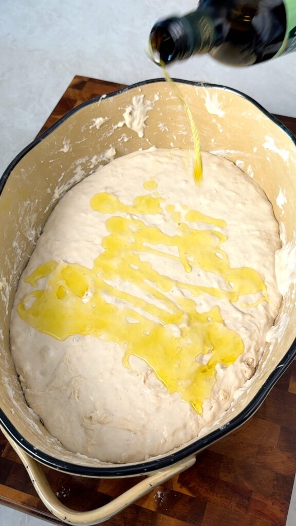 Pour olive oil over the rested dough and work it in with your hands or a spatula. Cover and rest for another 30 minutes.