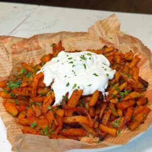 Crispy oven baked fries tossed in a garlic chili Bata Harra style sauce made with tomato paste, spices, and fresh parsley. Finished with a cool spoonful of vegan sour cream or yogurt for the perfect hot and cold contrast.