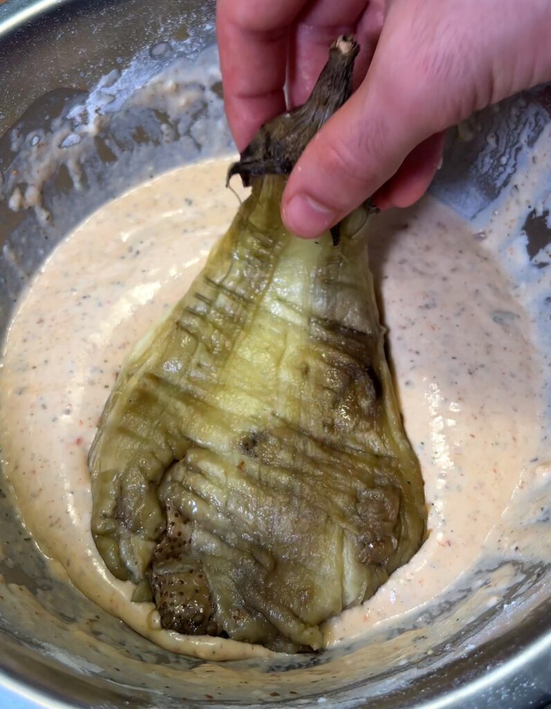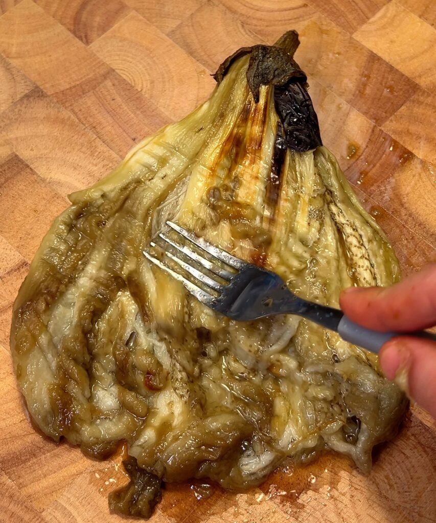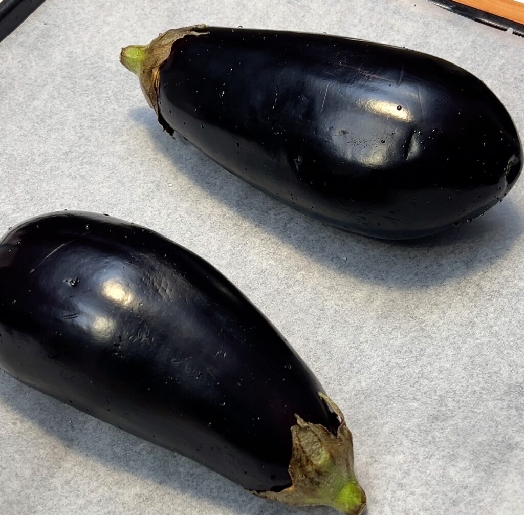 - Bake Eggplant: Preheat the oven to 200°C (400°F). Prick the eggplants with a fork and bake until soft, about 20-30 minutes. Remove from oven, let cool slightly, peel off the skin, and flatten gently.