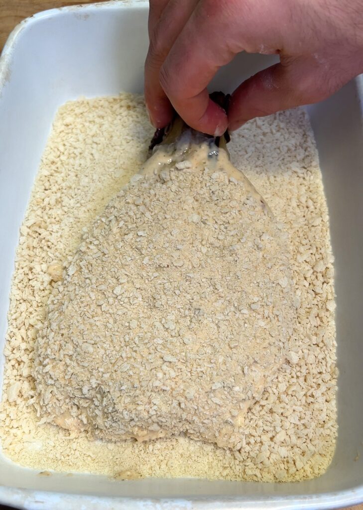 - Coat Eggplant: Dip each flattened eggplant slice in the wet batter, then coat with panko breadcrumbs.