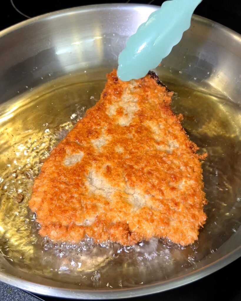 - Fry Eggplant: Heat olive oil in a pan and fry the breaded eggplant until golden brown on each side. Drain on paper towels.